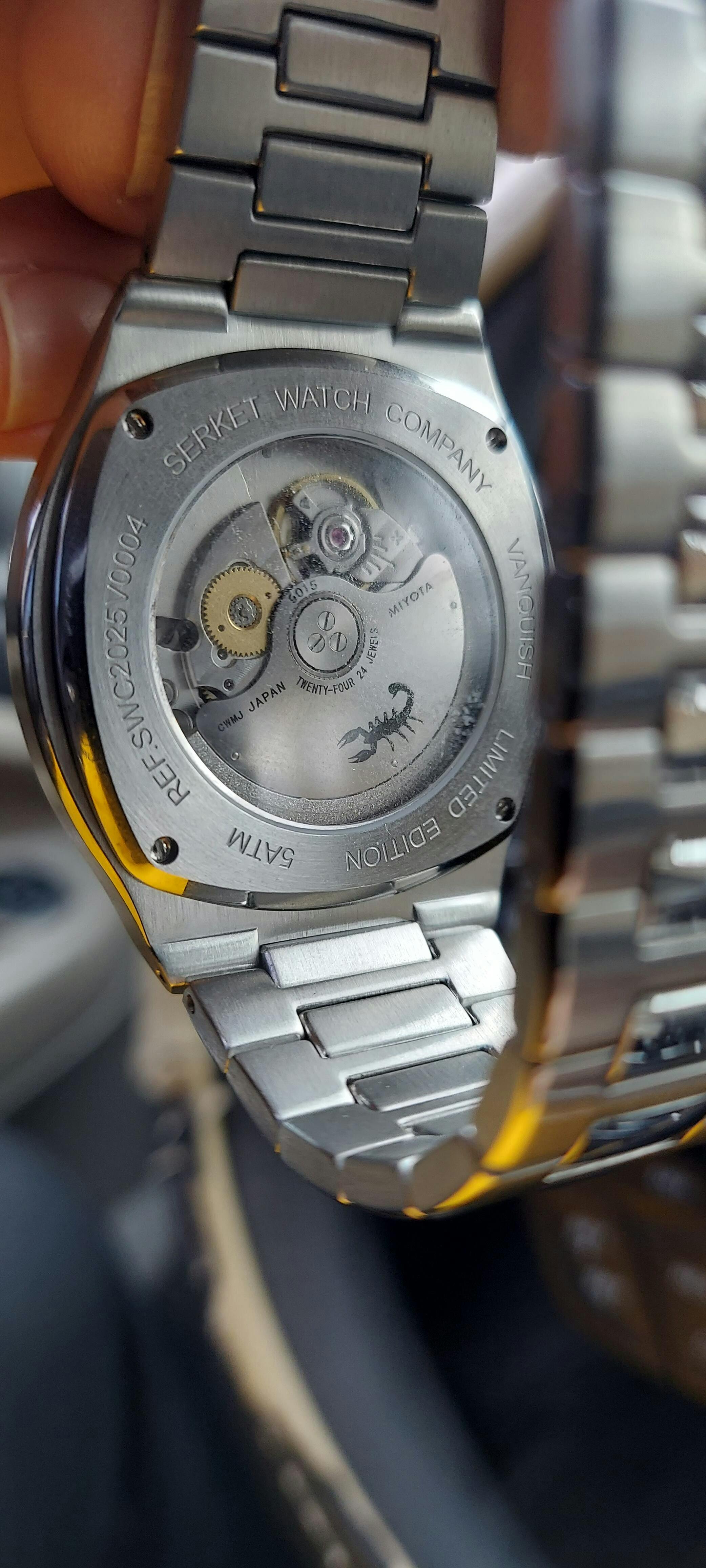 Turn it over, and the exhibition caseback reveals a custom scorpion on the rotor — a symbol of focus, strength, and precision.